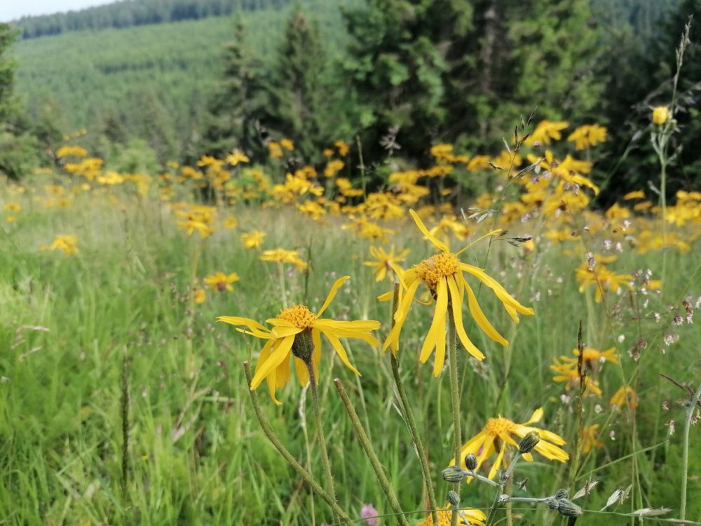 Mir kommt es durchaus wie ein Wunder vor, wenn aus zerstörter Natur in unfassbarer Fülle die schönsten Heilkräfte hervorquellen, wie es gerade hier im Erzgebirge nach dem bergbaulichen Raubbau allerorten bestaunt werden kann. Ein besonders eindrücklicher Ort, um betrachten zu können ist der Zechengrund am Fichtelberg bei Oberwiesenthal. Am vergangenen Wochenende durchwanderten wir ihn mit einer heiteren Gruppe und konnten uns gar nicht genug freuen, in welcher flächendeckenden gelben Schönheit sich die „zerzausten“ Arnikablüten (Arnica montana, auch Bergwohlverleih) der Sonne entgegen streckten. Die beigefügten Fotos von Susann vermitteln einen Eindruck davon. Wer das im Original bestaunen will, hat derzeit noch die Möglichkeit dazu.