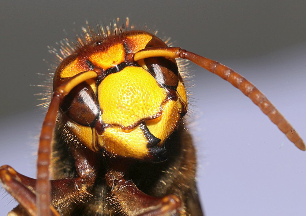 (Das ist zwar keine Wespe sondern eine  verwandte Hornisse, doch sie blickt so bewusst, was gut zum nachfolgenden Text passt. - Fotoquelle: Rolf Dietrich Brecher, via Wikimedia Commons)