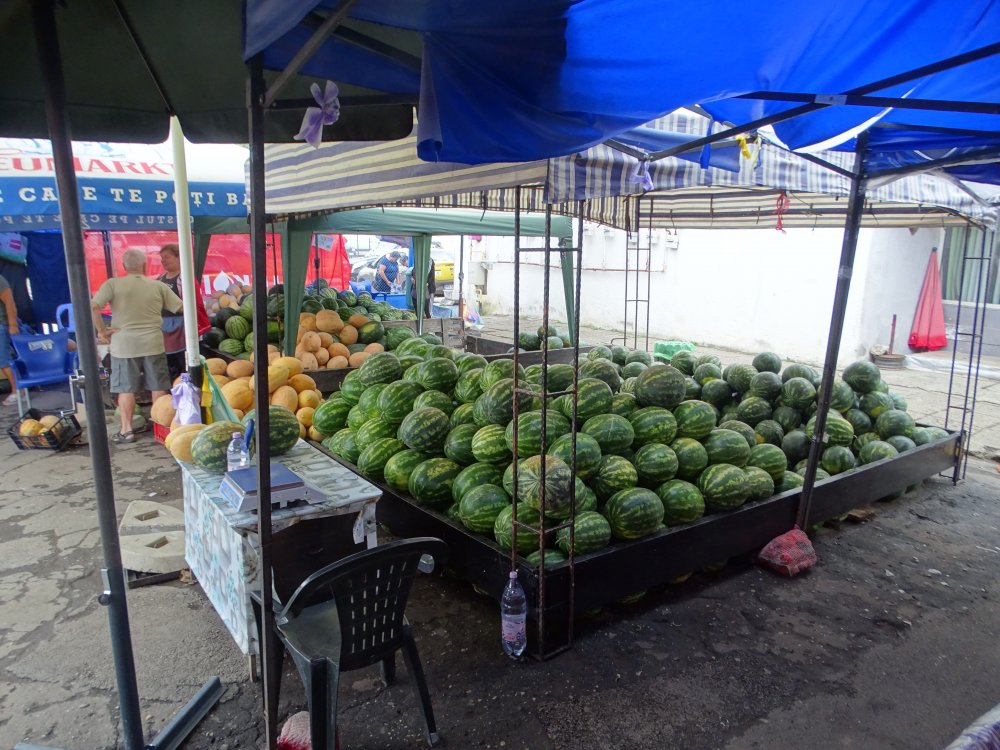 Wassermelonen auf einem Obst- und Gemüsemarkt in Schässburg/Siebenbürgen in Rumänien - Fotos: Hendrik Heidler