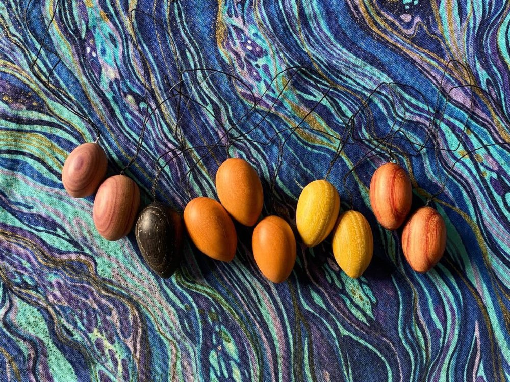 • 35fc44937cb6a7bedff9dc9640146102.jpg R6 Ostereier (von links) aus Flieder, Ebenholz, Lachsholz, Osagedorn, Rosenholz á 6,- Euro