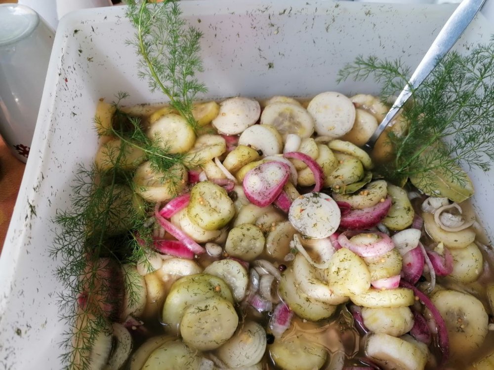 Die Büfettvorbereitungen laufen eine ganze Woche auf Hochtouren, so dass wir den Kräuternachmittag auch bei Schlechtwetter durchführen. Es wäre zu schade für die vielen liebevoll angerichteten Kräuterköstlichkeiten. Deshalb haben wir dafür große Mannschaftszelte bzw. Pavillons aufgebaut, in denen wir notfalls trocken und gemütlich wunderschöne Kräuterbilder per Beamer betrachten, das reichhaltige Büfett genießen und gemeinsam die Tinktur anfertigen können.